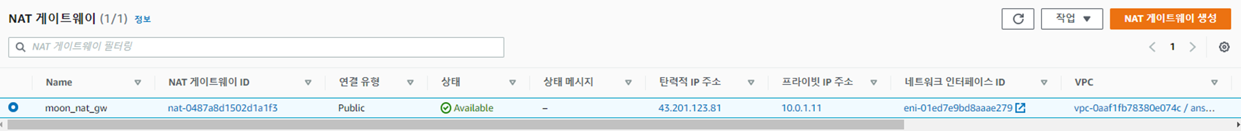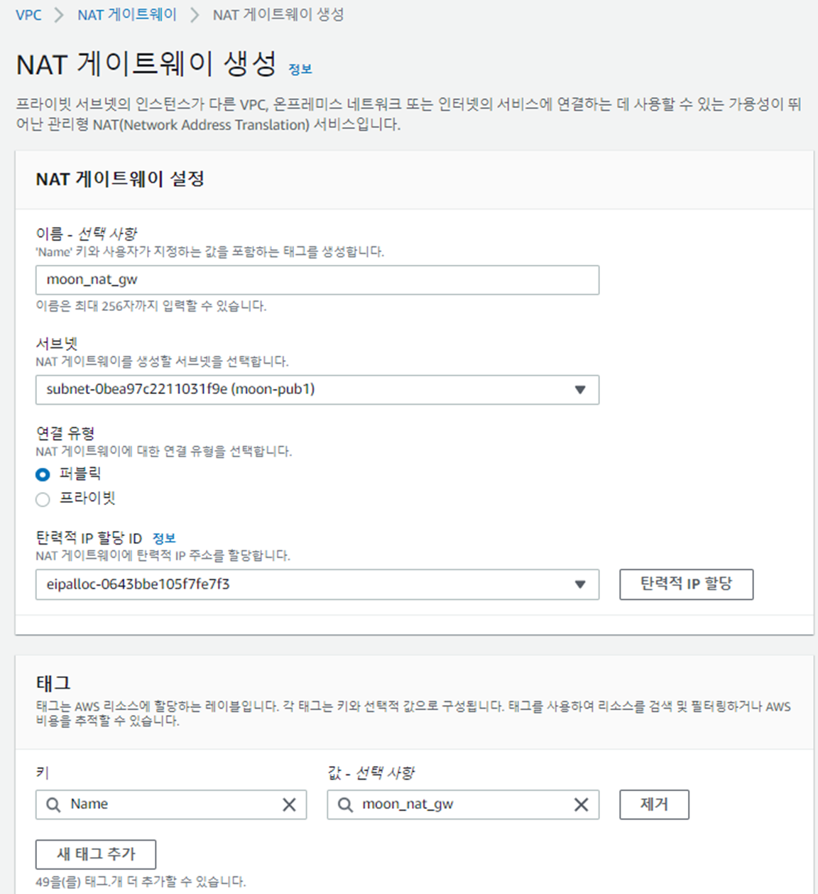 1) VPC - NAT 게이트웨이 - NAT 게이트웨이 생성