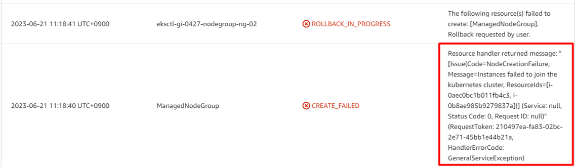 Resource handler returned message: "[Issue(Code=NodeCreationFailure, Message=Instances failed to join the kubernetes cluster, ResourceIds=[i-0aec0bc1b011fb4c3, i-0b8ae985b9279837a])] (Service: null, Status Code: 0, Request ID: null)" (RequestToken: 210497ea-fa83-02bc-2e71-45bb1e44b21a, HandlerErrorCode: GeneralServiceException)