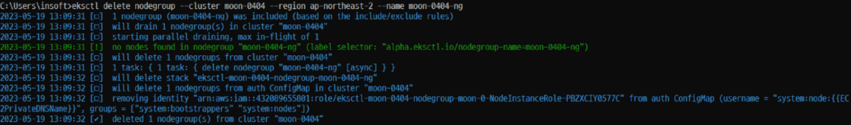 # eksctl delete nodegroup --cluster [CLUSTER NAME] --region ap-northeast-2 --name [NODEGROUP NAME]