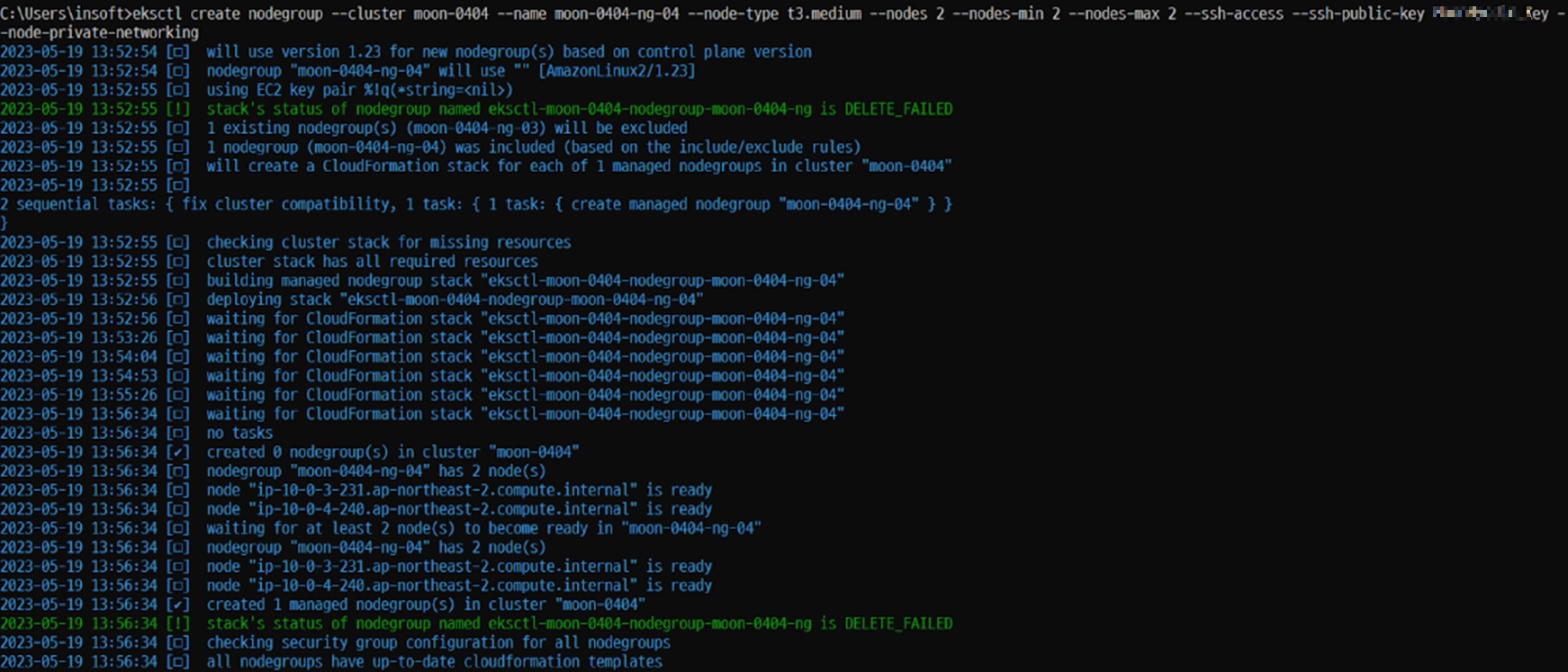 eksctl create nodegroup --cluster moon-0404 --name moon-0404-ng-04 --node-type t3.medium --nodes 2 --nodes-min 2 --nodes-max 2 --ssh-access --ssh-public-key MY_Key --node-private-networking