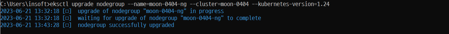 eksctl upgrade nodegroup --name=moon-0404-ng --cluster=moon-0404 --kubernetes-version=1.24