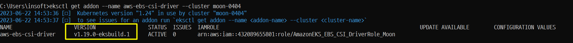 eksctl get addon --name aws-ebs-csi-driver --cluster <CLUSTER>